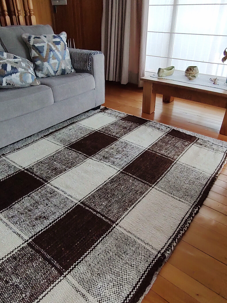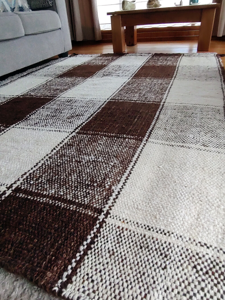 Frazada de lana oveja , confeccionada en telar quelgo, completamente a mano. Tejida por artesanas de la isla de Quinchao utilizando productos locales.