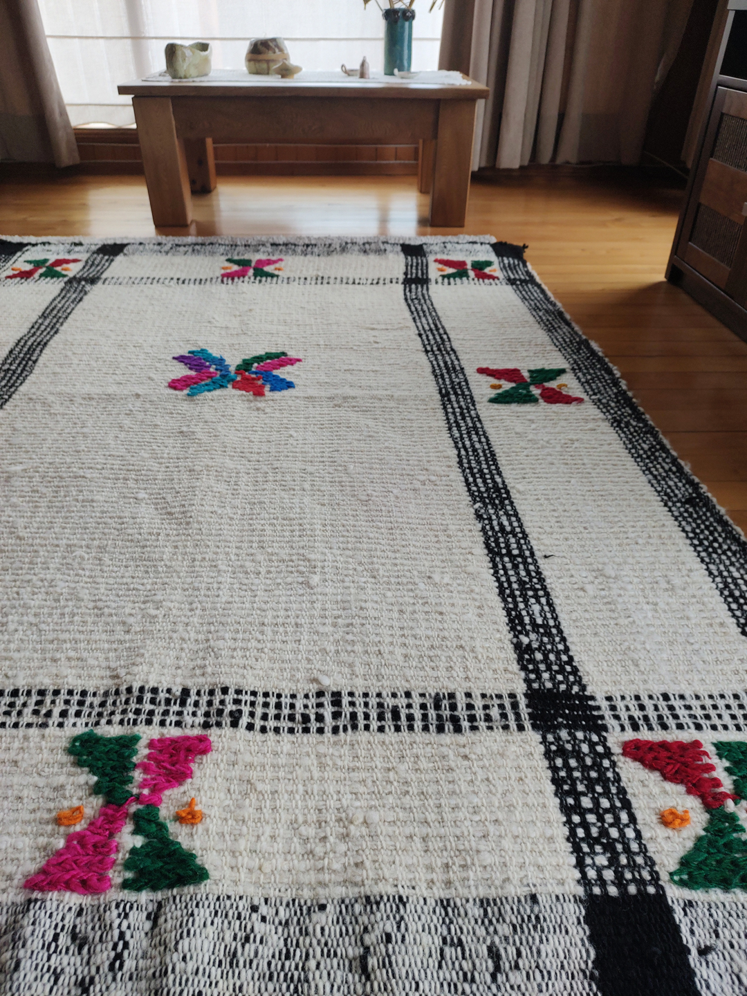 Esta hermosa Frazadas con flores Chiloé, tejida en forma artesanal, por artesanas locales, ocupando materia prima de la zona, presentan esta maravillosa pieza única, utilizando la técnica de brocado y tres tramas.